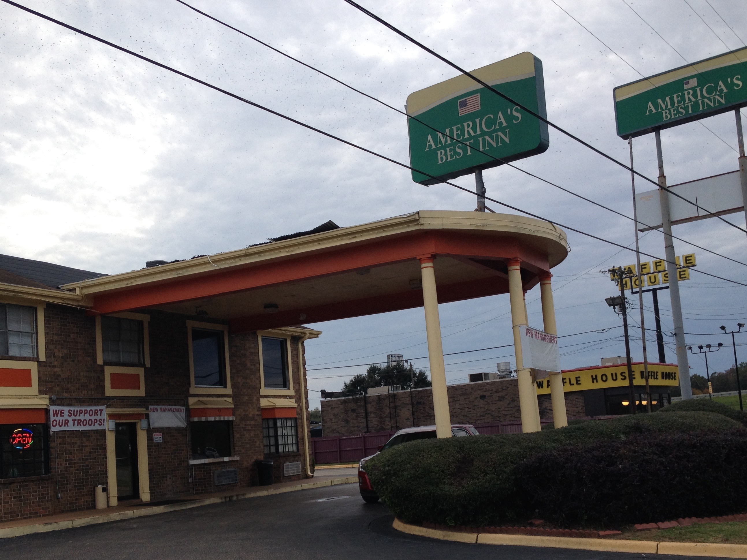 In the middle of writing that I felt a bit hungry, and I realized I would be making an enormous mistake if I didn’t go and get something to eat. There was a gallery of fast food places across the street from the depot—and by street I mean highway. This terminal is on the outskirts of Montgomery, and it could really be the outskirts of any southern city. KFC, Popeye’s, Pizza Hut, Arby’s, McDonald’s, Burger King, and, my drug of choice, Waffle House. So I put my laptop in my backpack and my back pack on my back, and went out. I walked along the highway in the direction of the Waffle House, waiting for an opening, then dashed across when no cars were coming from either side. Except one car pulling out, around
