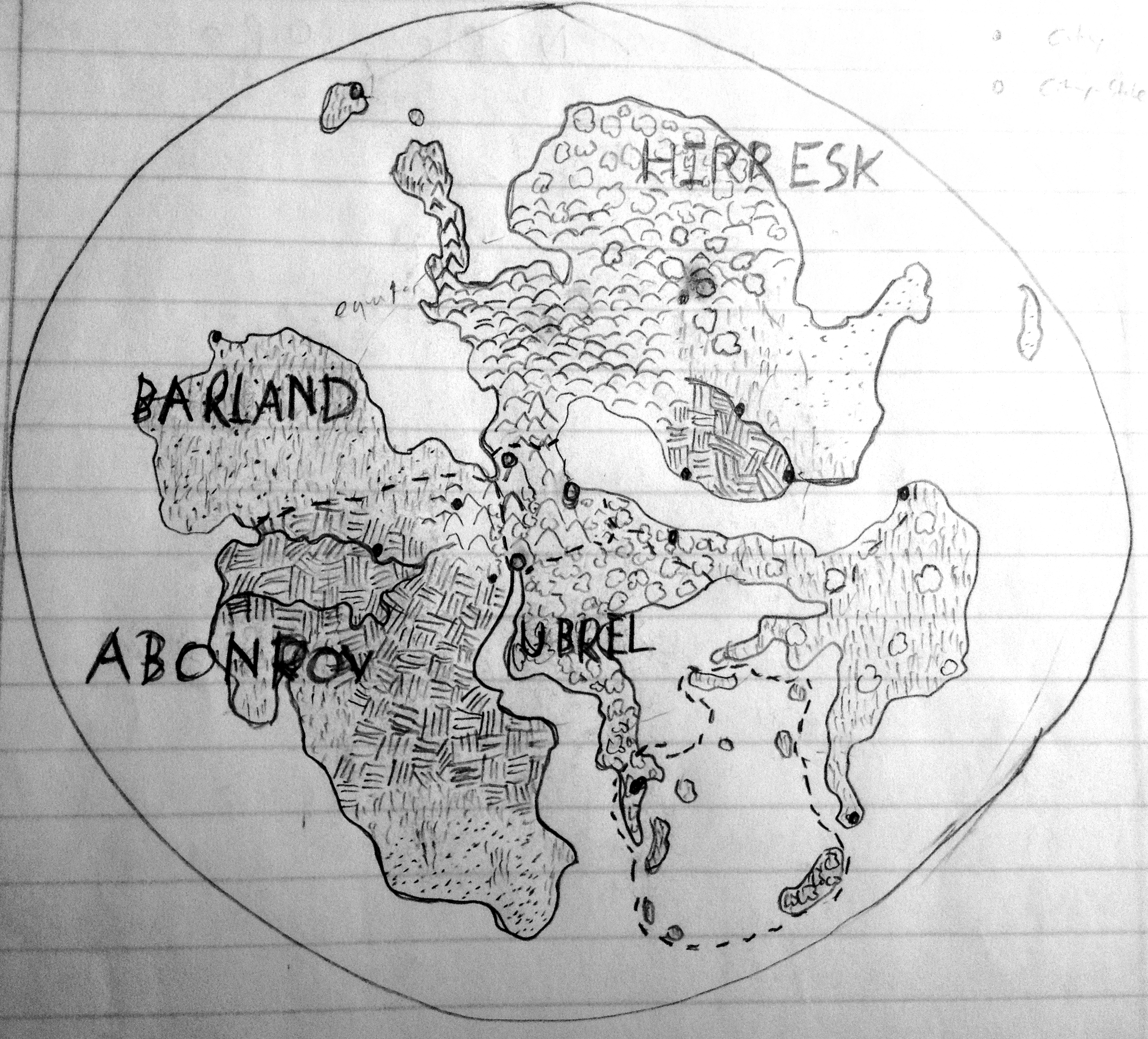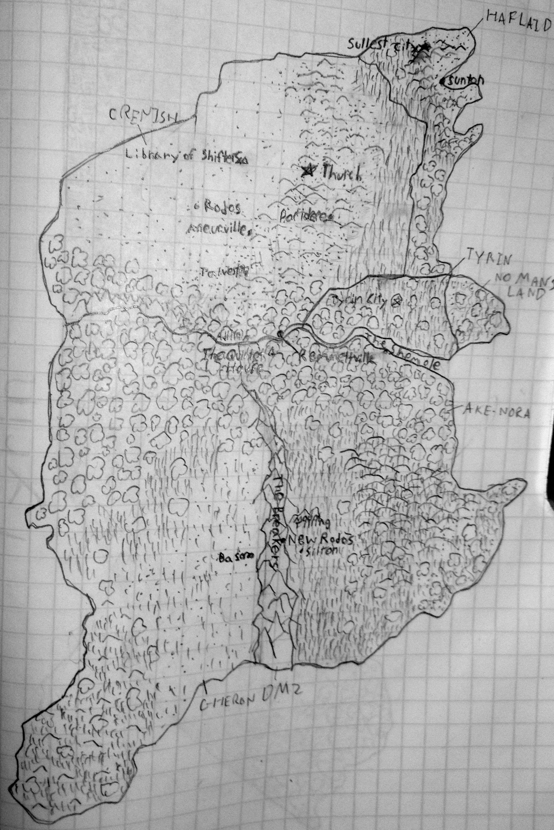 While all of these decisions could be made without anything being drawn out, I still prefer to use maps. Maps impose boundaries. Obviously they impose political boundaries, but they also impose boundaries on what I can and can’t write. If a city is located in a polar region, I can’t write about how everyone there grows bananas. This forces me to make more consistent, controlled decisions, rather than being able to roam freely. By deciding terrain and coastline and political boundaries beforehand, I lock the world down as a concrete place that doesn’t just bend to the needs of the story.