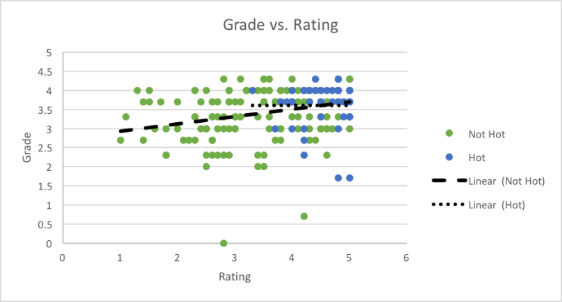 While I will not be able to determine whether my specific reasons are the cause for hot teachers receiving higher ratings, I will at least be able to determine if the ratings reflect grades received.