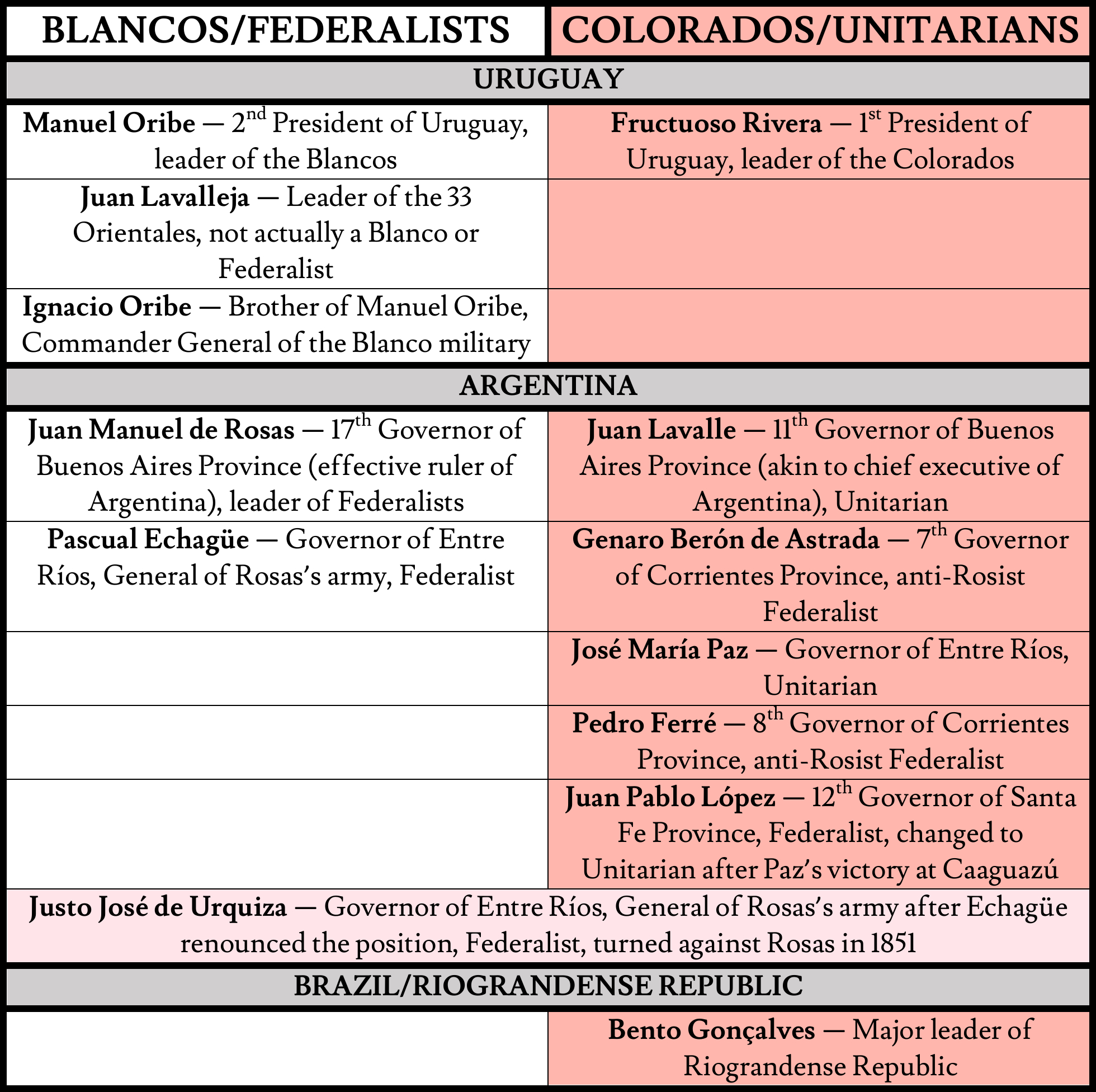 Lavalleja joined Oribe, and Juan Lavalle (IMPORTANT: Juan Lavalleja ≠ Juan Lavalle), an exiled Argentinian Unitarian, joined Rivera. The Unitarians were an Argentine party that wanted a centralized government, modeled on the government of the Napoleonic Empire. They were mostly a party of intellectuals, military figures, and the elite—as were the Colorados, whose support lay in Uruguay’s urban center of Montevideo, rather than the rural population. The Colorados favored free trade, free navigation of rivers by European ships, and immigration. The Blanco party was supported by the Argentine party then in power, led by Juan Manuel de Rosas, the Federalists. The Federalists favored a decentralized form of governance. Internally, the Blanco party drew its support from wealthy landowners and the rural population of Uruguay.