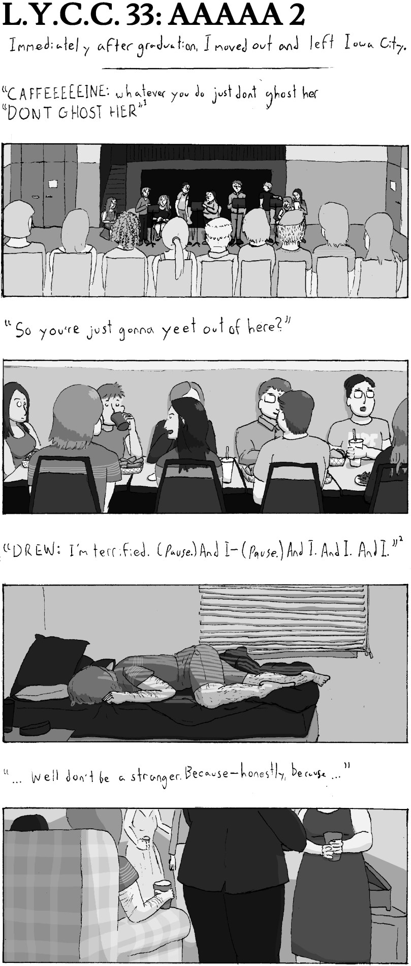Want a more convenient way to read this comic? Want to monetarily support this comic and more things like it? Want to read some brand new, previously unpublished Francis Bass scribbles? Great! You can buy a downloadable, PDF version of L.Y.C.C. at Gumroad or Itch.io. In addition to all of L.Y.C.C., this book includes “Last Summer,” a shorter series of comics made over the summer following my graduation, as well as older proof-of-concept comics and a quick step-by-step description of my process for creating L.Y.C.C.