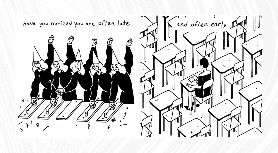 The next three issues are less esoteric, following somewhat narrative structures, but with illustrative-associative sections mixed in as well. #4, for instance (which may be my favorite of the whole book) portrays a woman’s internal monologue pointing out all the ways she fails to make real connections with other people. The combinations of these two modes—illustrative and narrative—is powerful. The narrative gives the reader a specific character and scenario to focus on, while the illustrated portions can be super-expressive, transcending the immediate reality of the scene. Think, for instance, of the emotional impact of “have you noticed you are often late / and often early” paired with just, like, talking heads and gesticulating hands, versus this: