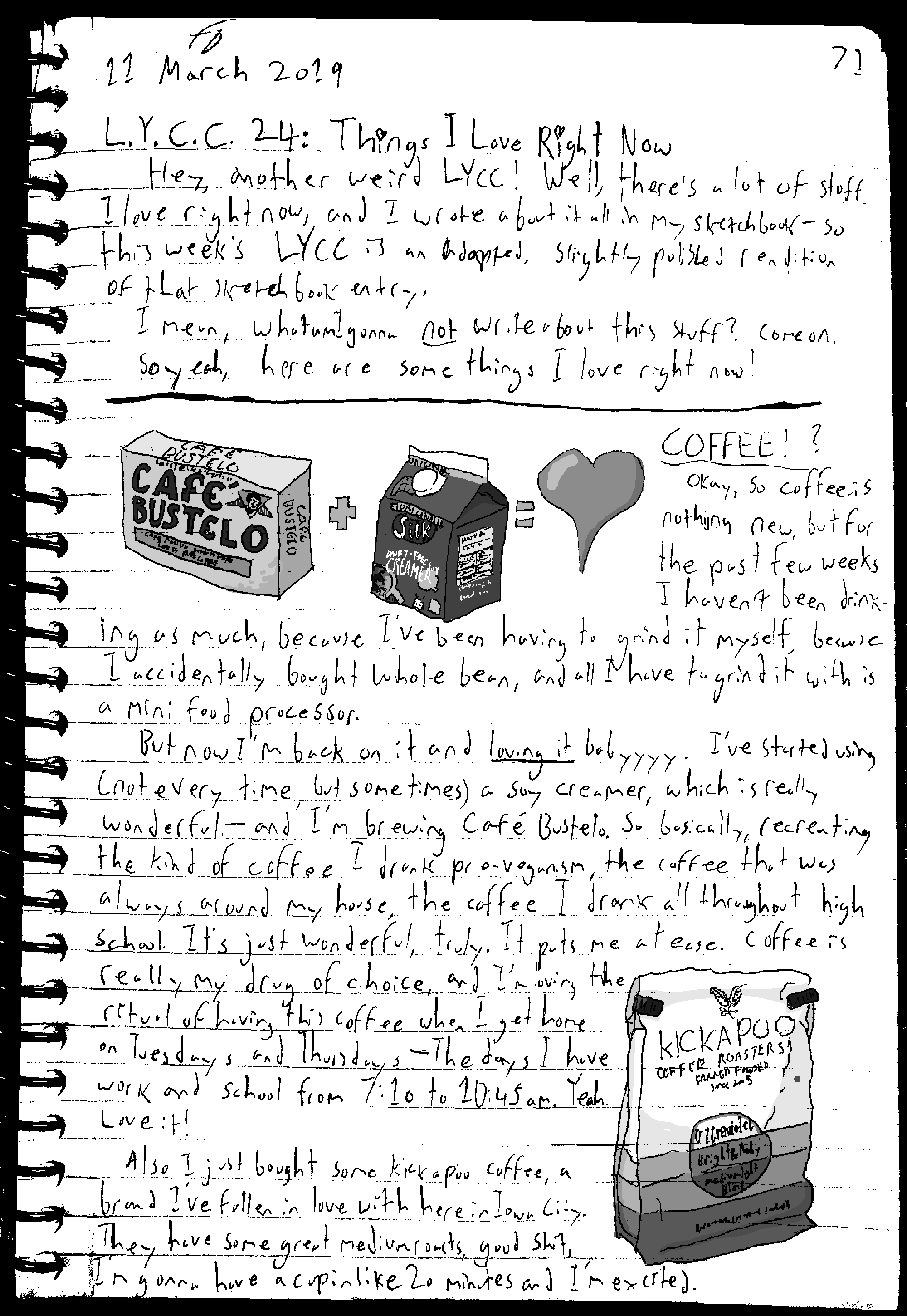 Blog housekeeping: Whew! That was a lot, huh! I may end up releasing an ebook version of LYCC with some extra stuff, or this may be its final form. Regardless, what’s online now will always be available for free, and I will hopefully do more sequential art stuff sometime in the future. That could mean a year from now, or five, but it’s definitely something I’ve enjoyed, so yeah. This isn’t the last of my comicking! I may also post sort of doodley little one-off autobio comics and drawings on twitter from time to time? so maybe follow me there? And in case you missed it, I posted the proto-version of LYCC up there a couple months ago, so you can check that out if you want a little more autobio comic content right now.