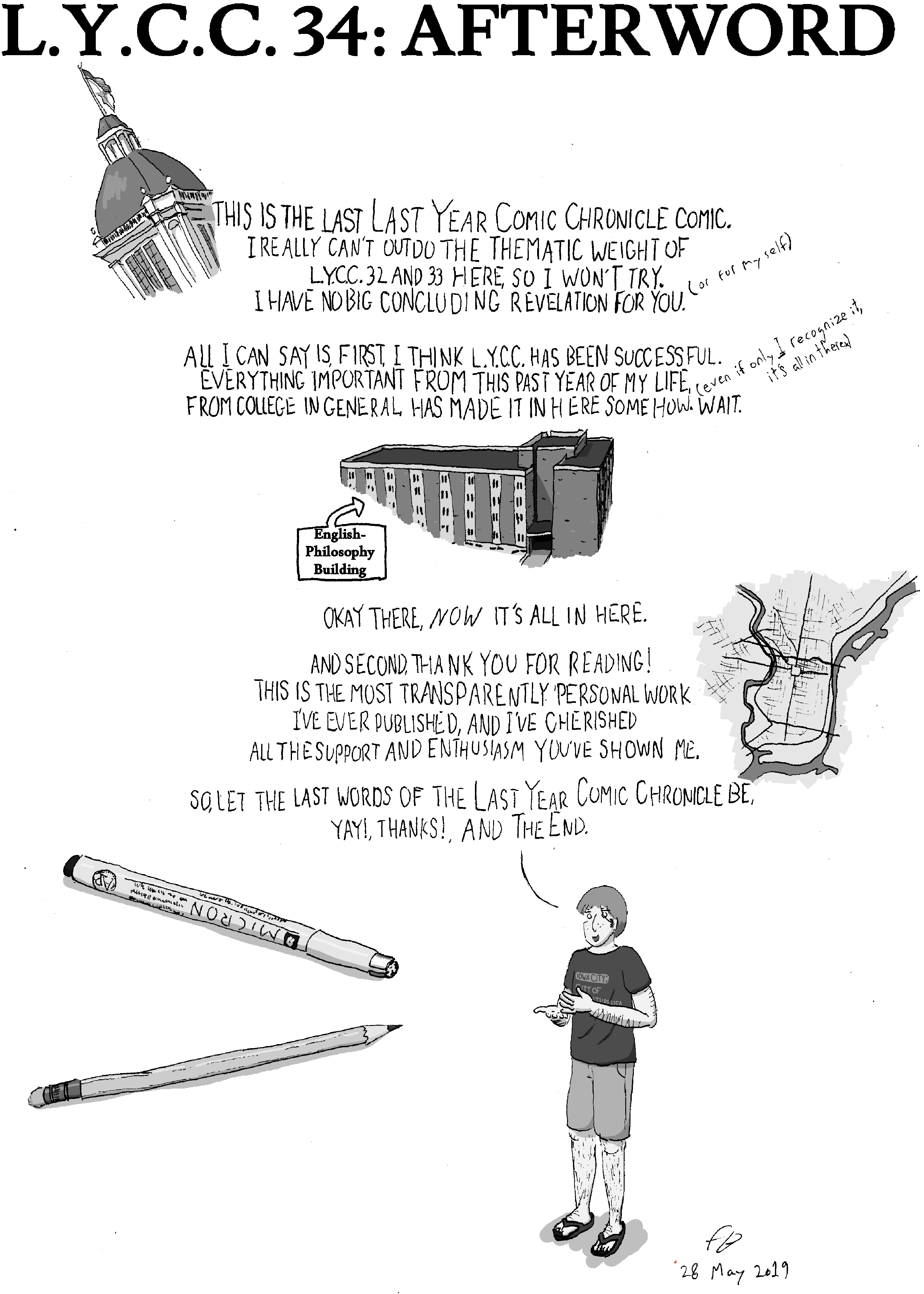 This is the last Last Year Comic Chronicle comic. I really can’t outdo the thematic weight of L.Y.C.C. 32 and 33 here, so I won’t try. I have no big concluding revelation for you.