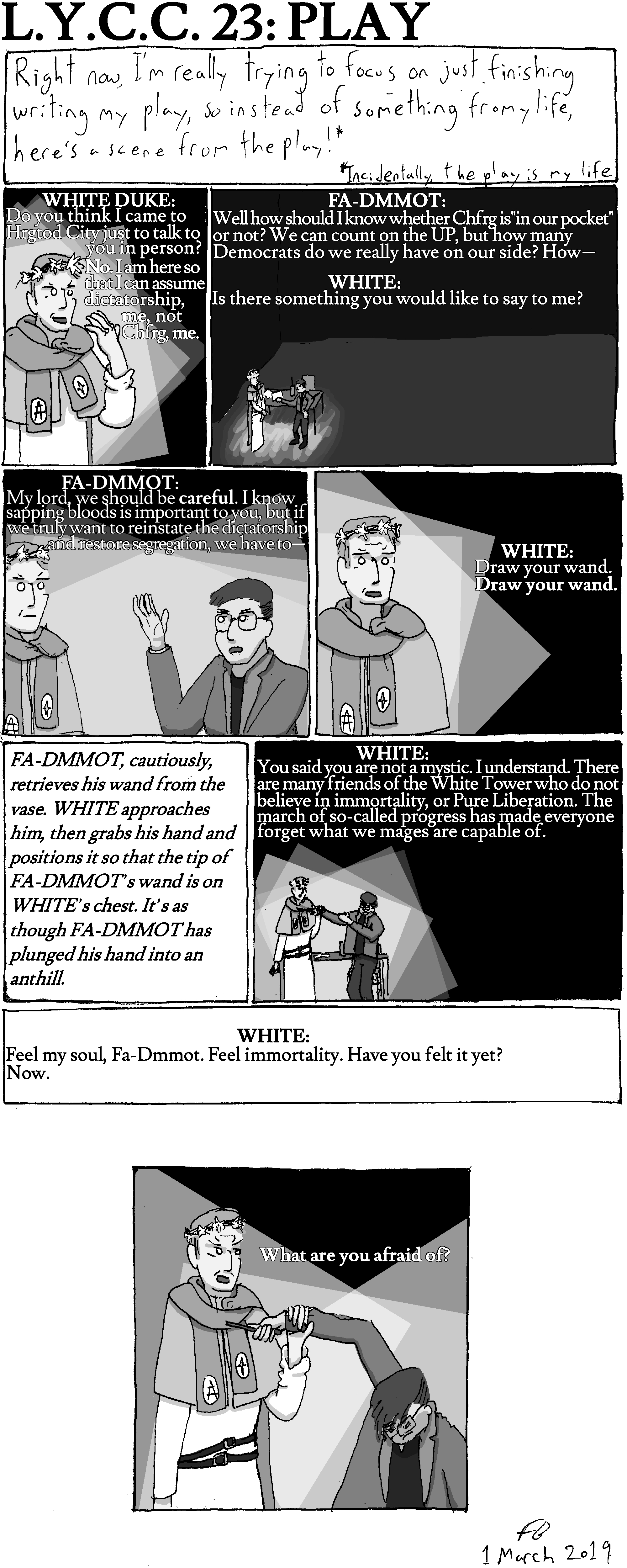 Want a more convenient way to read this comic? Want to monetarily support this comic and more things like it? Want to read some brand new, previously unpublished Francis Bass scribbles? Great! You can buy a downloadable, PDF version of L.Y.C.C. at Gumroad or Itch.io. In addition to all of L.Y.C.C., this book includes “Last Summer,” a shorter series of comics made over the summer following my graduation, as well as older proof-of-concept comics and a quick step-by-step description of my process for creating L.Y.C.C.